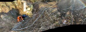 Sono stati subito effettuati sopralluoghi specifici con i geologi interni all’Ente e si è provveduto ad affidare un incarico specifico a un ingegnere-geologo di provata esperienza. La soluzione progettuale di messa in sicurezza individuata ha consistito nell’imbragare il masso con pannelli di rete in fune e reticolo di contenimento, vincolati ad ancoraggi ubicati a una certa distanza dal blocco instabile (>10 m); scelta resasi necessaria sia per l’assenza di un affioramento roccioso in prossimità del blocco, sia per non indurre vibrazioni durante la perforazione.