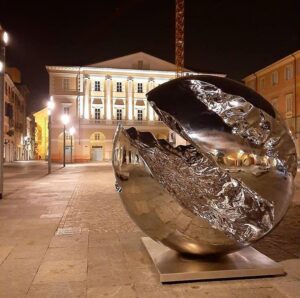 Tra gli accordi di collaborazione tra l’I.N.A.C., Istituto Nazionale d’Arte Contemporanea e il Comune di Casale Monferrato, rientra la progettazione, promozione, realizzazione della mostra “Urban Vibrations. Casale Risplende. Helidon Xhixha”, che è anche la XIV edizione de “La leggerezza della scultura”. La mostra è realizzata a cura di Anselmo Villata, Presidente dello stesso I.N.A.C., con il patrocinio degli Enti promotori e dell’Université Montpellier III Paul Valéry (Francia) e il sostegno della Fondazione Cassa di Risparmio di Alessandria. Le opere scultoree monumentali presenzieranno il centro storico di Casale Monferrato dal 10 novembre 2020 al 28 febbraio 2021. Questa l’affermazione del curatore: “Con le istallazioni pubbliche delle opere monumentali di Helidon Xhixha si vuole arricchire questo tessuto urbano con un percorso intenso e vivace in cui l’incontro con le opere vibranti e ricche di movimento (in perfetta sintonia con il casalese Bistolfi) plasmato attraverso l’interazione con la luce, doni al centro storico di Casale una nuova forma. In questo modo si potrà guidare chi vive Casale (abitanti o turisti) attraverso un itinerario che sia coinvolgente e consenta di vivere e vedere il centro storico attraverso uno sguardo nuovo, grazie alla presenza delle grandi opere monumentali che con la loro presenza imponente modificheranno la percezione dei luoghi e degli spazi. Attraverso la ricerca dell’interazione tra le architetture casalesi e le sculture del Maestro di origini albanesi, sarà possibile offrire una vera e propria esperienza ai visitatori che avranno l’opportunità di vivere una intensa interazione tra la storia e il presente, tra la struttura del reale e la percezione intensa e personale data dai materiali riflettenti e movimentati delle sculture in acciaio lucido….” Sono nove le opere collocate in punti strategici che segnano un percorso ricco di storia e di attualità, di architetture di varie epoche che si specchiano e interagiscono con le sculture di Xhixha. Ecco che la percezione dello spazio e dello scenario urbano si modifica, diventa mutevole, offre un nuovo modo di vedere l’ambiente circostante anche maggiorente illuminato grazie alla luce riflessa dalle superfici specchianti e riflettenti delle opere. Queste le collocazioni: “Elliptical Reflection”, nel cortile del Castello; “Terra Ferma”, nella Piazza del Castello; “Nebula” e “Capitello d’Acciaio”, davanti e accanto al Teatro Civico; “Neon” e “Saturno”, nella Piazza Mazzini; “Inner Peace”, a Palazzo Langosco (Biblioteca Civica); “Roccia Marina” e “Corallo d’Acciaio”, nel Chiostro di Santa Chiara del Museo Civico e Gipsoteca Bistolfi. È interessante informare e sottolineare che è stato attivato un QR Code, comunicato sullo stendardo affisso all’ingresso del Castello, in aiuto ai visitatori, che può ritenersi sia una guida alla visita che l’indicazione delle didascalie delle opere. La mostra è corredata da un libro edito per l’occasione da Verso l’Arte Edizioni, 128 pagine a colori, introdotto dai saluti istituzionali di Federico Riboldi e Gigliola Fracchia, rispettivamente Sindaco e Assessore alla Cultura di Casale Monferrato, contenente il testo critico di Anselmo Villata, le fotografie delle opere esposte, la biografia dell’artista.