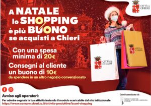 Prenderà il via venerdì 4 dicembre e durerà fino a giovedì 31 dicembre l’iniziativa «A Natale lo Shopping è più Buono se acquisti a Chieri», ovvero Buoni Shopping da 10 euro spendibili solo nei negozi chieresi convenzionati. «Si tratta di un’iniziativa che ricalca quella dello scorso luglio, “Lo Sconto È + Buono”. In questa seconda ondata dell’emergenza sanitaria, abbiamo ritenuto necessario riproporre i Buoni Shopping come misura integrativa a sostegno delle attività commerciali in sofferenza, quali gli esercizi di vicinato e le medie strutture non alimentari, i parrucchieri e gli estetisti, gli esercizi di somministrazione e le attività artigianali-spiega l’assessore al Commercio Luciano PACIELLO –abbiamo stanziato 55mila euro per emettere 5.000 voucher del valore di € 10,00 cadauno, oltre alla campagna di promozione. I Buoni Shopping saranno spendibili fino al 31 dicembre, abbiamo ampliato la platea degli esercenti che possono aderire (restano fuori solo la grande distribuzione e le medie strutture food), non c’è l’obbligo dello sconto del 10%, il limite della spesa è stato portato da 40 a 20 euro, non è più previsto il meccanismo della “girata”, i voucher sono spendibili anche negli esercizi di ristorazione e altresì nel pagamento delle vendite con consegne a domicilio».