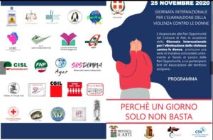 Anche quest’anno l’Assessorato alle Pari Opportunità del Comune di Asti, in occasione della Giornata Internazionale per l’eliminazione della violenza contro le donne, promuove una serie di iniziative concordate unitamente al Tavolo di lavoro delle Pari Opportunità, a cui partecipano Enti e Associazioni del territorio astigiano. Il risultato di una profonda sinergia che ha visto la realizzazione del calendario “Perché un giorno solo non basta” che raccoglie una serie di appuntamenti online che metteranno la donna al centro, proponendo, in modi e con percorsi diversi, occasioni di riflessione e di discussione sul tema della violenza contro le donne.