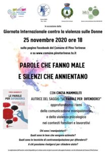 In occasione della Giornata Internazionale contro la Violenza sulle Donne l’Amministrazione comunale di Pino Torinese propone l’incontro on line “Parole che fanno male, silenzi che annientano”: un appuntamento “a distanza” che vedrà la partecipazione del Sindaco, Alessandra Tosi, dell’Assessore alle Pari Opportunità, Caterina Piana, della Presidente della Consulta Giovani di Pino e componente della FIDAPA Sez. Pino-Chieri, Elisa Pagliasso, e di Cinzia Mammoliti, esperta di Criminologia, Psicopatologia forense e Psicologia criminale e che si occupa di consulenza e formazione dopo aver lavorato per molti anni con donne e minori vittime di violenza.