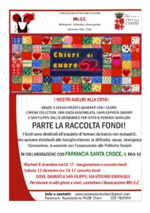 Martedì 8 dicembre dalle 10 alle 17 in via Vittorio Emanuele davanti alla chiesa di San Filippo,  sarà installata l’opera collettiva “Chieri di cuore”, realizzata da alcune socie dell’associazione  Mu.S.E. e da numerose cittadine chieresi (oltre 100 persone, per un totale di 358 “cuori”, tutti realizzati durante il lockdown!). Contestualmente presso il nostro gazebo inizierà la raccolta fondi destinata all’acquisto di farmaci da banco non mutuabili che saranno distribuiti da gennaio alle famiglie chieresi in difficoltà a causa della pandemia. Collaborerà all’acquisto dei farmaci la Farmacia Santa Croce di via Riva.La raccolta fondi si replicherà anche sabato 12, sempre in orario 10-17. L’opera resterà esposta fino al 6 gennaio.Chi volesse contribuire ma fosse impedito a venire al gazebo in quegli orari, può contattare direttamente l’associazione per concordare altra modalità.