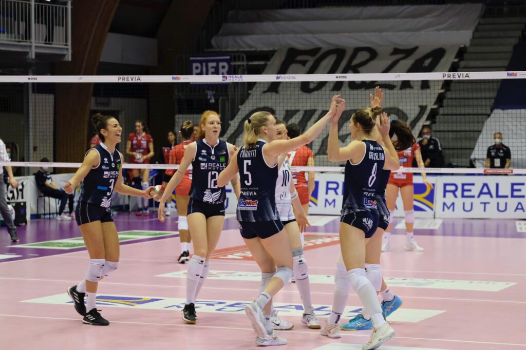 Terzo set – Sul 2-2 va al servizio Bosio e il suo turno di battuta frutta un break di 7 punti che pone un’ipoteca sull’esito del set e dell’incontro. Turino esaurisce i time-out sul 9-2, quindi tenta di carte Enright e Valentin per Lanier e Prandi. Nel prosieguo il gioco resta saldamente in mano alla Reale Mutua Fenera Chieri ’76 che raggiunge il distacco massimo di +10 sul 21-11 (Frantti). Sul 24-16, dopo una prima palla match annullata da Loda, il pallonetto di Zambelli fa scendere i titoli di coda sulla partita.
