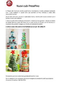 Anche in questo anno particolare i Papà in Gioco vorrebbero, con il vostro aiuto, creare un clima natalizio come segno di speranza. Potete aiutarci in due modi diversi, sia realizzando insieme ai vostri bambini delle decorazioni per un albero di Natale che verrà posizionato in piazza a Pino, sia creando dei piccoli alberelli di Natale, costruiti con qualsiasi materiale e tecnica vogliate, da posizionare all’interno dei nuovi cubi del PresePino. Perché non fare entrambe le cose?!!! Siamo convinti che i vostri bambini saranno felici ed orgogliosi di creare decorazioni natalizie insieme al proprio papà o la propria mamma e che potranno poi ammirare passando, mentre andranno a scuola o all’asilo, davanti al PresePino e all’albero di Natale presenti in piazza a Pino. Siamo infatti certi al 100% che un solo loro sorriso riuscirà a rendere anche questo Natale un momento felice e magico! I consigli per realizzare le decorazioni li trovate nel file allegato. Buon divertimento!!!