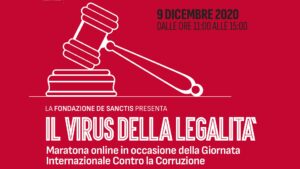 In occasione della Giornata Internazionale contro la Corruzione promossa dall’UNESCO, venti tra magistrati, prefetti, personalità del mondo della politica e dalla giustizia parteciperanno a Il virus della legalità, evento online ideato dalla Fondazione De Sanctis e moderato da tre brillanti firme del giornalismo italiano: Pietro Del Soldà, Marco Filoni e Giulio Gambino.La maratona verrà trasmessa in diretta streaming mercoledì 9 dicembre, dalle 11:00 alle 15:00.