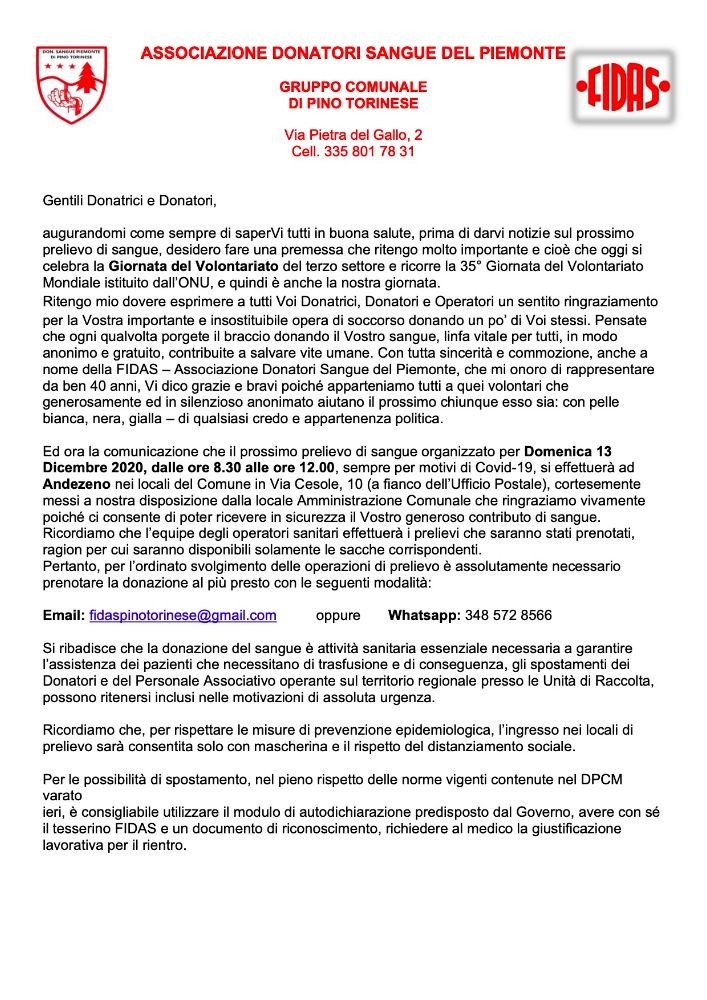 Il Gruppo Fidas di Pino Torinese organizza dalle h. 8,30 alle h. 12,00 di domenica 13 dicembre la raccolta delle donazioni di sangue. Qui di seguito le informazioni di dettaglio nella lettera del Presidente del Gruppo Fidas di Pino Torinese Edoardo Benedicenti.