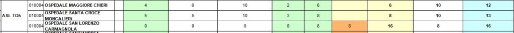 Torino città (262): AOU Città della Salute e della Scienza (132), Asl Città di Torino (98), 32 AO Mauriziano (32);Torino area metropolitana (133): AOU San Luigi (24), Asl To3 (33), Asl To4 (48), Asl To5 (28);Cuneo (115): Asl Cn1 (41), Asl Cn2 (26), AO Santa Croce e Carle di Cuneo (48); Alessandria (84) : Asl Al (48), AO Santi Antonio e Biagio e Cesare Arrigo (36);Novara (72): AOU Maggiore della Carità di Novara (48), Asl Novara (24);Vercelli (32): Asl Vc (32);VCO (28): Asl Vco (28);Asti ( 24): Asl Asti (24);Biella (24): Asl Biella (24).