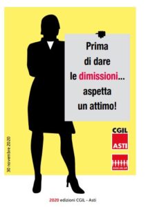 “Prima di dare le dimissioni… aspetta un attimo!“: s’intitola così l’opuscolo redatto dalla Cgil Asti che sarà in distribuzione sul territorio nei prossimi giorni. L’iniziativa nasce dall’osservazione delle casistiche di accesso agli uffici della Camera del Lavoro negli ultimi mesi e dai dati dell’ufficio per l’impiego, dai quali si evince che soprattutto le donne sono state colpite dalla contingenza della pandemia e hanno presentato domanda di dimissioni dal posto di lavoro. La difficoltà di conciliare tempi di vita e tempi di lavoro, la difficile gestione dei figli con scuole e asili chiusi, il cambiamento degli orari lavorativi, ha reso sempre più difficile alle donne lavoratrici riuscire a gestire il proprio impiego. La percentuale di donne che hanno lasciato il lavoro nei primi sei mesi dell’anno è passata dal 41% al 48% rispetto al 2019.