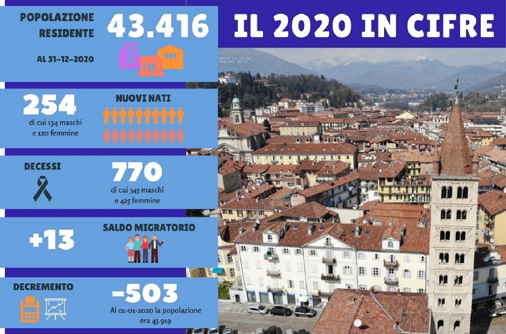 I residenti nel capoluogo al 31 dicembre sono 43.416. Il Coronavirus fa registrare un incremento di decessi del 42%, in un anno 770 morti
