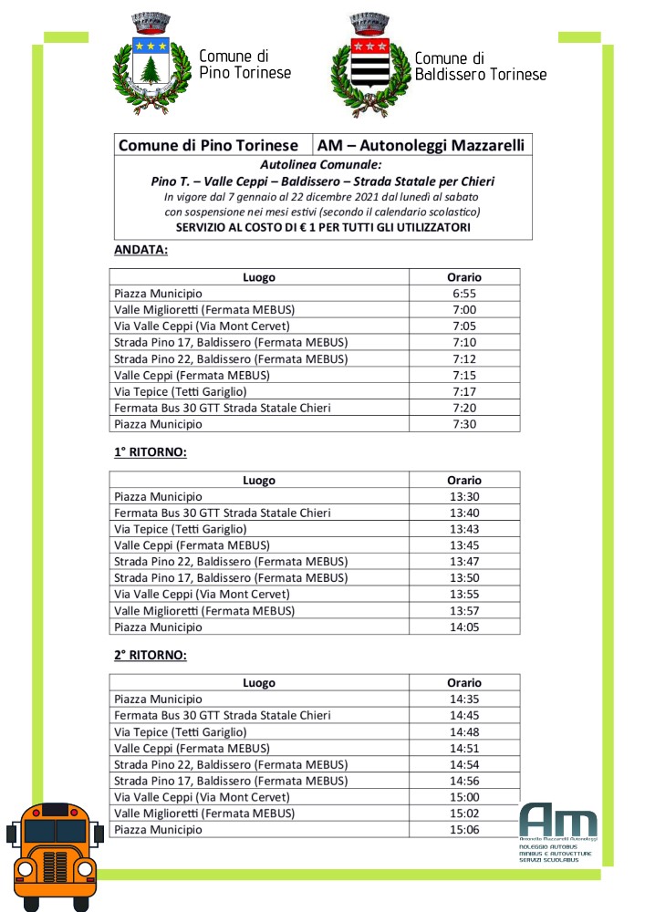 È ripreso il 7 gennaio 2021 il servizio comunale di collegamento tramite navetta tra Pino Torinese, Valle Ceppi e Baldissero. Sarà attivo fino al 23 dicembre 2021 dal lunedì al sabato (secondo il calendario scolastico).