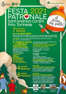 Il Covid non ferma la tradizione a Pino Torinese: in occasione della Festa Patronale di S. Andrea Corsini, infatti, si è voluto mantenere il ricco programma di iniziative e appuntamenti come già nei precedenti anni. Con un tocco di innovazione e modernità e sfruttando gli strumenti che la tecnologia mette a disposizione. Si parte giovedì 4 febbraio alle ore 21 con l’appuntamento on line “Le nostre radici il nostro futuro” trasmesso sul sito www.comune.pinotorinese.to.it. Un appuntamento a cura del Museo delle Contadinerie che vedrà protagonisti cultura, tradizioni e persone pinesi. Sabato 6 febbraio trasmissione del Concerto di S. Andrea Corsini sul sito del Comune di Pino Torinese con partecipazione di Federica Leombruni, mezzosoprano, Stefano Arato, fisarmonica Musiche di Tosti, Vierne, Scarlatti e Alberto Arato. In apertura si esibiranno inoltre alcuni allievi della sezione musicale della Scuola Media di Pino. Domenica 7 febbraio alle 11.30 appuntamento con la S. Messa trasmessa in diretta streaming sul canale Youtube della Parrocchia SS. Annunziata: un’occasione per vivere insieme questo momento sempre molto partecipato con un’attenzione particolare, però, alla sicurezza e al rispetto delle norme anti-covid. A seguire non mancherà il tradizionale Disnè dij Paltò che quest’anno, viste le disposizioni antiassembramento vigenti, si terrà in modalità diffusa … ovvero direttamente nelle case dei pinesi! Una novità proposta grazie alla preziosa collaborazione dei ristoratori del territorio, che prepareranno il menu, e delle associazioni di Pino, a partire dalla Pro Loco, che si occuperanno della consegna a domicilio dei pasti precedentemente prenotati. Partecipare è semplice: è sufficiente prenotare, entro il 3 febbraio 2021, il proprio pasto di S. Andrea Corsini presso i seguenti punti vendita:
