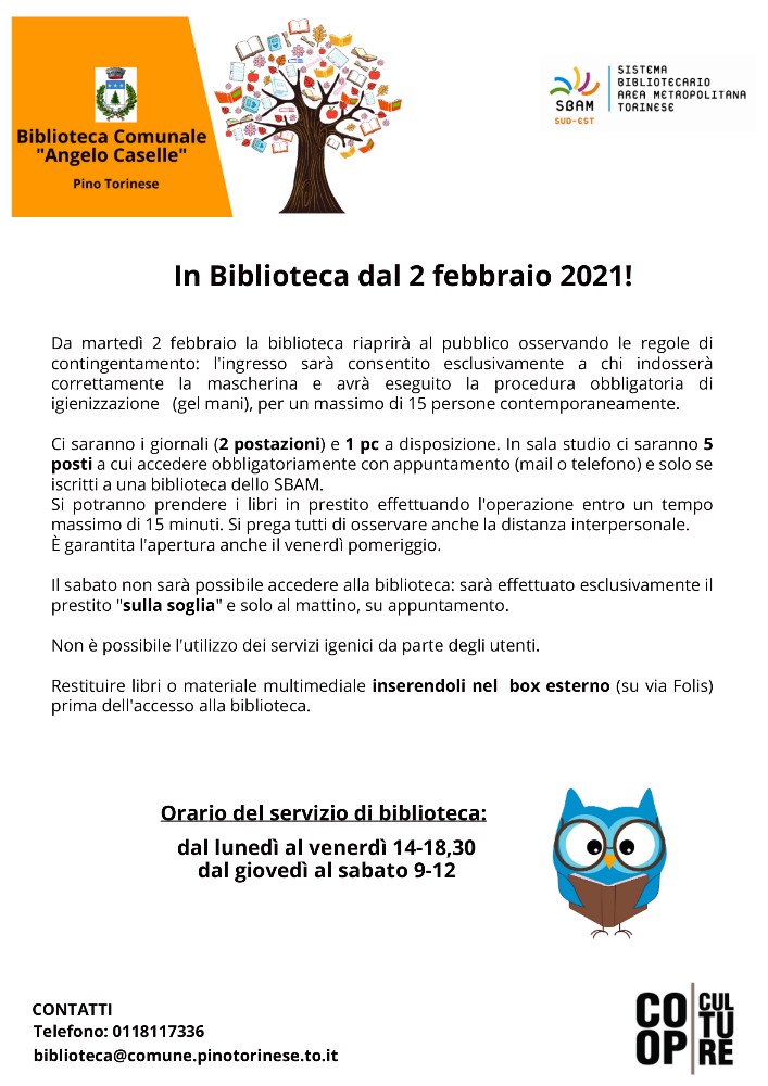 Pino Torinese, riaperta al pubblico la Biblioteca Comunale “Angelo Caselle” di Redazione · 4 Febbraio 2021 Visto da: 56