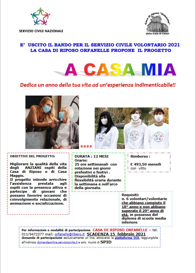 Ancora per pochi giorni è possibile partecipare al Bando del progetto di Servizio Civile 2021 ” A Casa mia ” , proposto dalla Casa di Riposo Orfanelle di Chieri in collaborazione con la città metropolitana di Torino . Sono disponibili 6 posti per ragazze/i, in età compresa tra i 18 ed i 28 anni, motivati ad una esperienza di volontariato con gli anziani. Non è necessaria una esperienza pregressa ed è sufficiente il diploma di licenza media media inferiore. Il servizio durerà un’anno , a partire dal luglio 2021 , con un compenso di circa 500 euro mensili. I ragazzi svolgeranno attività presso la Casa di Riposo e la Residenza Casa Maggio per il sostegno alle attività di assistenza e di animazione degli ospiti . Sono previste 25 ore settimanali di servizio, suddivise in 5 giorni la settimana , mattino o pomeriggio . La flessibilità oraria permette di poter frequentare corsi di formazione o l’università.