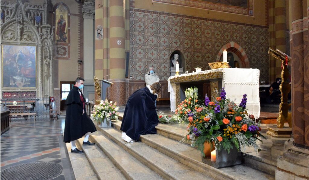 In ‘diretta’ TV su TeleCupole, la Messa delle 11 nel Duomo di Chieri è anche il momento-clou di questo strano carnevale ai tempi del covid: la Pro Chieri manda in onda la riconferma per il 2021 della Bela Tessioira e del Mangiagrop 2020, Roberta Ronco e Stefano Pennazio, che alla fine della Messa, presenti il sindaco di Chieri Alessandro Sicchiero e l’assessore calla cultura Antonella Giordano, portano il tradizionale omaggio floreale alla Madonna delle Grazie, patrona della città. Con la speranza che presto, il più presto possibile, la pandemìa ci lasci in pace e ci permetta di ritrovarci e di fare festa (Foto di Luciano Berruto)