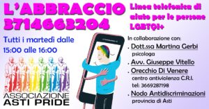 E’ nata, grazie all’associazione Asti Pride, L’ABBRACCIO, la linea telefonica di aiuto per persone LGBTQI vittime di discriminazione, violenza fisica o verbale a causa del proprio orientamento sessuale e della propria identità di genere.