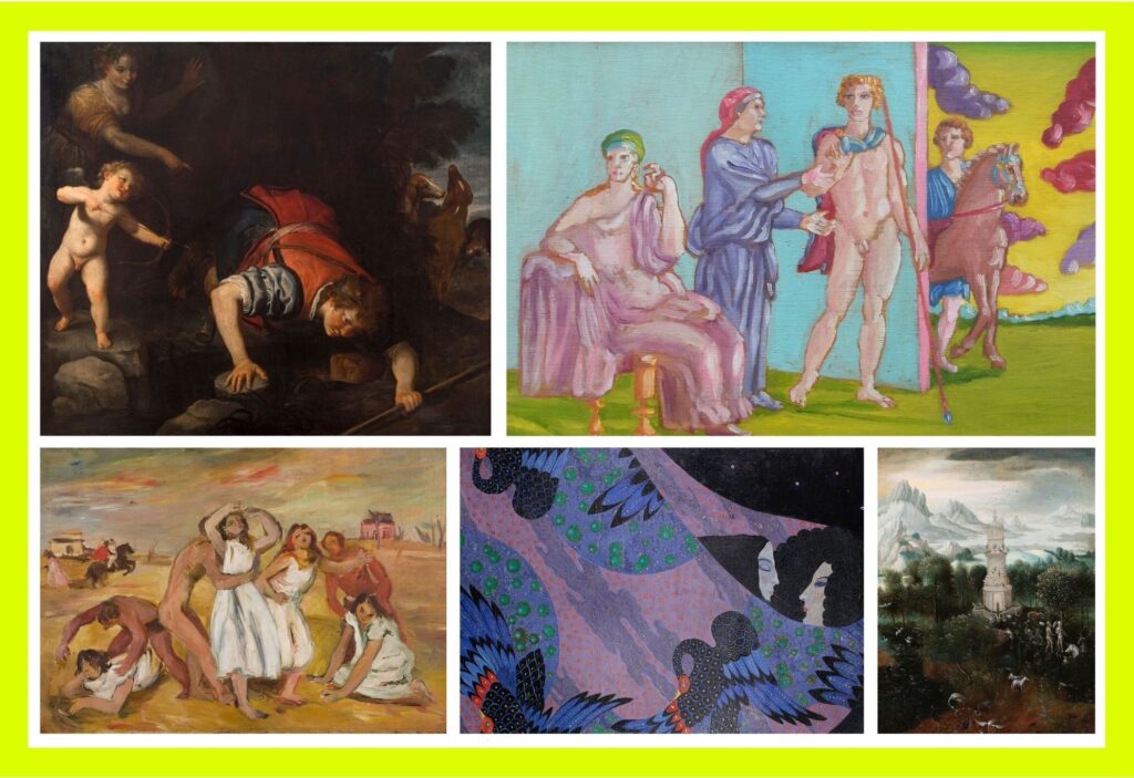 Nell’immagine, in alto a sinistra: Giovanni Andrea De Ferrari, Narciso alla fonte, la ninfa Eco e Amore prima metà del XVII sec., olio su tela, cm 148 x 180, courtesy of: Arcuti Fine Art, Roma; Torino (I). Segue: Salvo, Ippolito e Fedra, 1977, olio su tavola, cm 42 x 27, courtesy of: Claudio Poleschi Arte Contemporanea, Dogana (RSM).