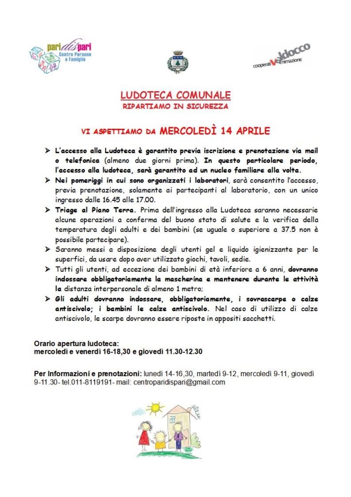 La Ludoteca Comunale sarà nuovamente aperta a partire da mercoledì 14 aprile: tenendo conto del particolare periodo l’accesso, previa prenotazione, sarà garantito ad un solo nucleo familiare. Nel seguente volantino tutte le regole da rispettare per garantire un accesso sicuro per tutti!