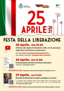 In occasione del 25 aprile, Festa della Liberazione, il Comune di Pino Torinese propone un momento di commemorazione con la partecipazione dei ragazzi dell’Istituto Comprensivo.Domenica 25 aprile, alle ore 10.30, verrà trasmessa on line sulla pagina facebook del Comune e sul sito istituzionale l’Infiorata alla lapide di Domenico Folis. In collaborazione con il Polo del ‘900 e l’Istituto Piemontese per la Storia della Resistenza e della Società Contemporanea “Giorgio Agosti”, verranno condivisi sui canali istituzionali del Comune due appuntamenti di informazione e sensibilizzazione: