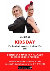 Proseguono le attività di “Spazio Spalancato”, il progetto con cui l’assessorato alle Politiche giovanili della Città di Biella intende proporre attività rivolte ai ragazzi. Dopo il successo con le attività dedicate al teatro e il corso “Speak With”, domenica 9 maggio è in arrivo il “Kids Day”. I bambini e i ragazzi dai 6 ai 14 anni avranno la possibilità di avvicinarsi al mondo del musical. L’evento si terrà a Palazzo Ferrero Miscele Culturali dalle 16,30 alle 18 grazie alle attività proposte da Mic&LAEli. Spiega l’assessore alle Politiche giovanili Gabriella Bessone: “Dopo l’avvio delle prime attività, domenica 9 maggio nel contesto di “Spazio spalancato” sarà proposta una nuova iniziativa, per i nostri bambini e ragazzi dai 6 ai 14 anni. C’è stato molto interesse e il calendario prosegue con nuovi contenuti”. Per ottenere maggiori informazioni è possibile scrivere alla mail micelaeli1@gmail.com o contattare il numero 347.7470425.