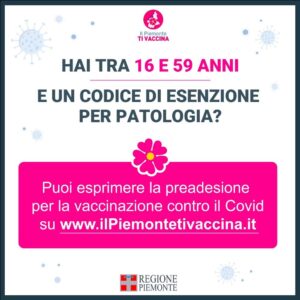 Da lunedì 26 aprile sono aperte le pre-adesioni alle vaccinazioni anti-Covid anche per i soggetti fragili tra 16 e 59 anni con esenzione per patologia, ma non classificati come estremamente vulnerabili.I nati tra il 1 gennaio 1962 e il 31 dicembre 2005 che presentano patologie o situazioni di compromissione del sistema immunitario possono effettuare la preadesione on line alla vaccinazione in maniera autonoma e senza inserire alcun dato sanitario. A tutela della privacy, all’atto della preadesione non saranno richieste informazioni relative alle proprie patologie.Per maggiori informazioni:www.ilpiemontetivaccina.it