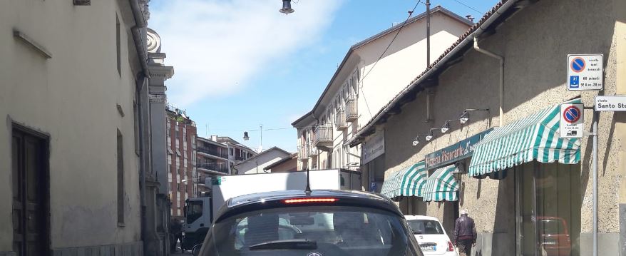 Era già successo qualche anno fa. La scena è la stessa, passo carraio di un  minimarket in Via Vittorio a Chieri, davanti all’oratorio San Luigi: un camion per effettuare il carico e scarico delle merci destinate al negozio rimane incastrato nel passaggio e il traffico è a lungo bloccato, fino all’arrivo dei soccorsi e della polizia locale.