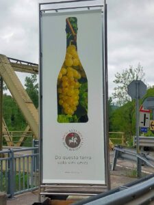 Perletto, Alta Langa, brinda con il moscato per il passaggio del giro. Questo il cartellone esposto al passaggio dei corridori, nela terza tappa della Corsa Rosa da Biella a Canale d’Alba