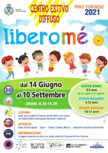Dopo il grande successo dell’edizione dello scorso anno torna, dal 14 giugno al 10 settembre, Liberomè, il Centro Estivo “diffuso” su tutto il territorio. Organizzato dal Comune di Pino Torinese in collaborazione con tante associazioni pinesi, prevede attività suddivise per fascia d’età per bambini a partire dai 3 anni, ragazzi e giovani fino ai 17 anni. Tante le iniziative in programma: maggiori informazioni su costi e modalità di partecipazione e iscrizione saranno presto pubblicate sul sito internet www.comune.pinotorinese.to.it
