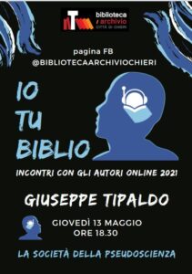- giovedì 13 maggio ore 18.30 La società della pseudoscienza. Orientarsi tra buone e cattive spiegazioni, con il Prof. GIUSEPPE TIPALDO, ricercatore di Sociologia dei processi culturali e comunicativi nell’Università di Torino https://www.comune.chieri.to.it/biblioteca/presentazione-tipaldo