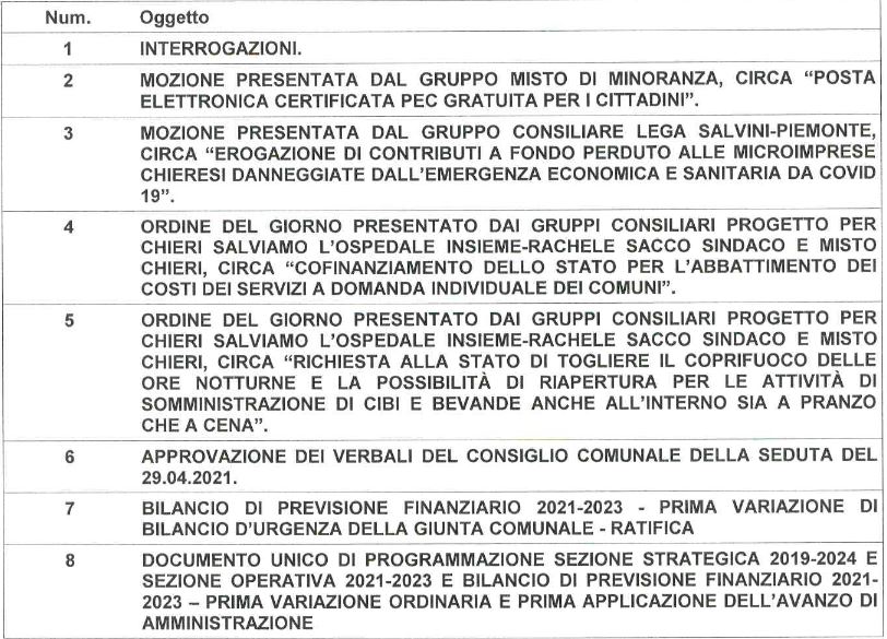 Il consiglio comunale di Chieri è convocato in videoconferenza martedì 18 e mercoledì 19 maggio alle 19,45.