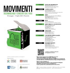 Movimenti è il titolo del nuovo cartellone di concerti dal vivo dell’Accademia di Musica di Pinerolo diretta da Laura Richaud, un invito a rimettersi in cammino, ad attraversare e lasciarsi attraversare da paesaggi sonori differenti, condividendo finalmente l’emozione dell’ascolto. Gli 8 concerti in programma tra maggio e luglio 2021 a Pinerolo, in parte nell’ambito della Stagione concertistica 2020/21, sperimentano infatti organici e ambiti musicali distanti fra loro, spaziando da Beethoven all’improvvisazione jazzistica, da Schubert alla musica klezmer, grazie al talento di importanti artisti di fama internazionale. Si parte martedì 18 maggio alle ore 20,00 nella sala concerti dell’Accademia di Musica di Pinerolo con la pianista Mariangela Vacatello, esibitasi in alcune tra le più importanti stagioni concertistiche del mondo, riconosciuta per la curiosità e versatilità degli orizzonti esecutivi, per il virtuosismo e la passione che si ritrovano in ogni brano che inserisce nel suo repertorio. Si prosegue una settimana dopo, martedì 25 maggio, sempre alle ore 20,00, in Accademia con un solista del calibro di Gabriele Mirabassi, da più di trent’anni al vertice tra i migliori clarinettisti del panorama mondiale, sostenuto dal magma sonoro e creativo di Simone Zanchini, considerato uno dei più originali e innovativi fisarmonicisti della scena internazionale. La promessa è quella di musica da camera tra improvvisazione, jazz, musica colta, popolare, sudamericana e radici italiane. Domenica 30 maggio alle ore 16,30 nel cortile della Firad – Diesel Fuel Injection sotto l’arco dello scultore Elio Garis, l’appuntamento è con Schubert, Vivaldi e l’energia dell’Orchestra da Camera Accademia, che ovunque riscuote grande successo di pubblico e critica. Maestro concertatore è Adrian Pinzaru, primo violino del Delian Quartett e docente dell’Accademia di Musica di Pinerolo. Violino solista è la giovanissima Flavia Napolitano, già vincitrice di primi premi assoluti in concorsi nazionali e internazionali. Movimenti prosegue anche a giugno (lunedì 7, martedì 8, lunedì 14 e martedì 22) e a luglio (mercoledì 7 luglio).