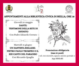 In occasione del settimo centenario dantesco, nel quadro delle manifestazioni “Biella per Dante” che prevede un ampio calendario di iniziative, presso la Biblioteca Civica di Biella si svolgeranno due incontri dal vivo.