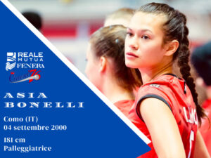 La palleggiatrice Asia Bonelli è la quarta novità della Reale Mutua Fenera Chieri ’76 per la prossima stagione.Classe 2000, nata a Como e di casa ad Albiolo, 181 cm d’altezza, è reduce dalla sua prima stagione in A1 disputata con Busto Arsizio: strani incroci del destino, aveva debuttato nella massima categoria proprio contro Chieri, l’1 settembre 2020, nei quarti di finale della Supercoppa.Appassionata di pallavolo fin da tenera età (ha iniziato a giocare a 7 anni), ha militato fino a 16 anni nella Polisportiva Intercomunale di Solbiate con Cagno. Poi le esperienza con Orago, Novara e Albese fra Under 18, B1 e B2, quindi nel 2019/2020 il suo primo campionato di serie A, con San Giovanni in Marignano in A2.In carriera ha vestito anche la maglia azzurra della nazionale Prejuniores, con cui ha vinto il Torneo delle Otto Nazioni in Portogallo.