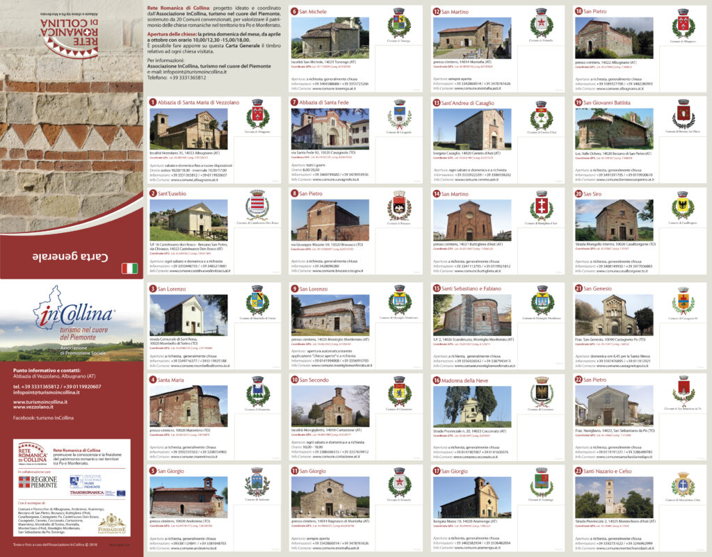 Rete Romanica di Collina: salgono a 23 le chiese aderenti al progetto ideato e coordinato dall’Associazione InCollina, turismo nel cuore del Piemonte, per valorizzare il patrimonio delle chiese romaniche nel territorio tra Po e Monferrato e sostenuto dai Comuni e Parrocchie di: Albugnano, Andezeno, Aramengo, Berzano di San Pietro, Brusasco, Buttigliera d’Asti, Casalborgone, Castagneto Po, Castelnuovo Don Bosco, Cavagnolo, Cerreto, Cocconato, Cortazzone, Marentino, Mombello di Torino, Montafia, Montechiaro d’Asti, Montiglio Monferrato, San Sebastiano da Po e Tonengo.Presso le singole chiese è possibile fare apporre su questa Carta Generale il timbro relativo ad ogni visita.