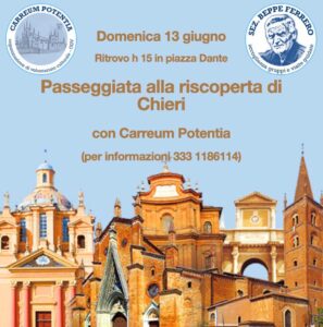 Dopo una lunga, forzata, interruzione vogliamo ricominciare a vivere la normalità che, per noi di Carreum Potentia, significa riprenderci la città, tornare a camminare per le sue vie, ammirarne i monumenti, raccontarne le storie. Domenica 13 giugno, ritrovo in piazza Dante alle 15, iniziamo una passeggiata alla riscoperta di Chieri. Indossare scarpe comode e munirsi di curiosità perché è prevista una pioggia di bellezza e di storia. L’iniziativa è gratuita e la durata prevista è di due ore e mezza circa. Per informazioni, Alfonso, Carreum Potentia – Sezione Beppe Ferrero – Accoglienza gruppi e visite guidate 333 1186114.