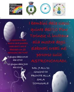I bambini delle classi quinte dell’I.C. Pino Torinese vi invitano alla mostra degli elaborati creati nel percorso sulle ASTRONOMIADI: saranno esposti dal 7 all’11 giugno davanti all’ingresso del Municipio. In occasione della mostra sarà inoltre possibile osservare il sole al telescopio con gli astronomi dell’INAF in questi momenti:
