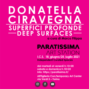 L’edizione di Paratissima 2020 fu interrotta, causa Covid, il 5 novembre e il terzo e ultimo appuntamento fu annullato. Il 13 maggio 2021, Paratissima rinasce e la ripartenza è caratterizzata dalla mostra fotografica di Peter Lindbergh: Untold stories. La prima mostra su Peter Lindbergh curata dall’autore stesso è un progetto allestito negli spazi dell’ARTiglieria Con/temporary Art Center, visitabile fino al 13 agosto. Negli stessi spazi, da giovedì 18 giugno al 25 luglio 2021, vengono proposti gli appuntamenti rimasti in sospeso nel 2020. Rebirthing Exhibition – Art toRestart è la mostra collettiva dedicata alle arti visive curata da Giulia Giglio e Paolo Lolicata. Ph.ocus – About photography è la sezione di fotografia di Paratissima curata da Laura Tota, deputata ad accogliere nei suoi spazi progetti di fotografia contemporanea ed eventi, incontri e workshop dedicati alla cultura visuale. I.C.S.(Independent Curated Spaces) ospiterà numerosi artisti presentati da dei curatori. Il saviglianese Marco Filippa (critico d’arte freelance che per anni ha co-curato, con Elena Privitera, le mostre di En Plein Air-arte contemporanea di Pinerolo) presenterà il lavoro della cuneese Donatella Ciravegna. Il titolo della mostra, Superfici profonde, è un ossimoro ideale per parlare di opere inedite, di un lavoro difficilmente ascrivibile in un ambito preciso. Potremmo definirlo fashion introspettivo per certi versi, come la pittura lo è stata per Frida Kahlo. Si pongono nella lunga scia dell’avventura surrealista (1924) le performance della Ciravegna, fissate in video e fotografie, i suoi abiti trasformabili, la sua collezione di oggetti ingabbiati. Se è vero  che l’abbigliamento è la nostra seconda pelle, quella che esponiamo nella società dello spettacolo. E se è vero che ogni minuto trentamila cellule muoiono e la nostra epidermide cambia completamente ogni mese; allora l’abito/pelle/io è la chiave del suo lavoro; del suo complesso vissuto umano, documentata con video performance e fotografie: inevitabile conseguenza del suo armamentario di abiti e oggetti di scena, pronti per essere presentati. La sua azione psicomagica ha dato un nome alle cose, ai traumi, alle cadute e alle risalite. Offrendosi alla vista accetta di esporre, letteralmente porre in essere, la sua opera, trattandosi della sua esistenza che, liberata da ogni pre-giudizio, si fa arte. Domenica 20 giugno alle 16.00, l’artista e il critico dialogheranno pubblicamente in un talk presso gli spazi dell’ARTiglieria.