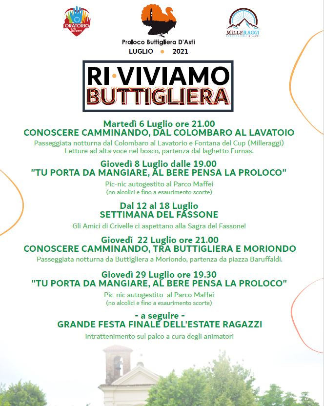 Ecco le attività della Proloco di Buttigliera d’Asti del mese di luglio. In collaborazione con:Associazione Milleraggi e Oratorio San Giuseppe. Tutte le proposte sono a ingresso libero (gratuite) ed è obbligatoria la prenotazione.