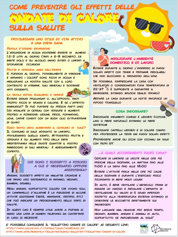 Anche per il 2021 l’Asl TO5 ha messo a punto un programma di prevenzione dei danni alla salute dovuti alle ondate di calore estivo: la campagna informativa ha lo scopo di far conoscere le principali misure di prevenzione per limitare gli effetti negativi sulla salute. Gli effetti del caldo sulla salute derivano dalla combinazione di alcune variabili meteorologiche quali umidità, temperatura, velocità del vento, giorni consecutivi di caldo. Utilizzando queste informazioni e combinandole con altre di tipo sanitario, il Dipartimento Sistemi Previsionali e l’Epidemiologia Ambientale di Arpa Piemonte hanno sviluppato un bollettino previsionale del caldo affinché la popolazione, soprattutto i soggetti a rischio (anziani, malati), possa adottare comportamenti e precauzioni per prevenire danni alla salute. Il bollettino fornisce inoltre indicazioni utili alle istituzioni per mettere in atto tempestivamente le misure e gli interventi preventivi più efficaci per la tutela della salute. Il cittadino può consultare, oltre ai bollettini previsionali delle ondate di calore, il materiale informativo del Ministero della Salute. Le ondate di calore si verificano quando si registrano temperature molto elevate per più giorni consecutivi, spesso associate a tassi elevati di umidità, forte irraggiamento solare e assenza di ventilazione. Queste condizioni climatiche possono rappresentare un rischio per la salute della popolazione. I livelli di rischio per la salute previsti dal Ministero sono definiti in relazione alle condizioni climatiche di una specifica città. L’esperienza passata ha mostrato come un’ondata di calore non prevista possa portare esiti letali e gravi danni alla salute della popolazione; in Italia almeno ottomila persone anziane sono decedute come causa diretta dell’ondata di calore dell’estate del 2003: si trattava principalmente di anziani soli, di età superiore a 75 anni e con patologie concomitanti. La prevenzione degli effetti negativi delle onde di calore è possibile: ad esempio, sapere in anticipo che l’ondata di calore sta per arrivare, permette di mirare in maniera ottimale gli interventi preventivi verso le persone a rischio più elevato.