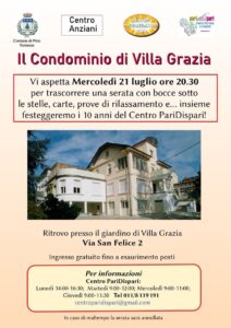 Il condominio di Villa Grazia vi aspetta mercoledì 21 luglio alle ore 20.30 per trascorrere una serata con bocce sotto le stelle, carte, prove di rilassamento e… INSIEME FESTEGGEREMO I 10 ANNI DEL CENTRO PARIDISPARI! Ingresso gratuito fino a esaurimento posti (in caso di maltempo la serata sarà annullata)