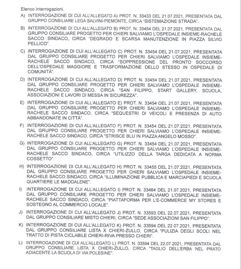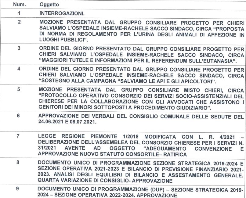 Il Consiglio Comunale di Chieri si riunisce in videoconferenza giovedì 29 e venerdì 30 luglio, dalle 19,45, con l’ordine del giorno che riportiamo qui sotto.