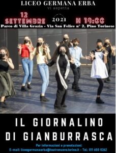 Con l’inizio del nuovo anno scolastico tornano gli appuntamenti dei G.E.T. – Germana Erba’s Talents.Domenica 12 settembre alle ore 18:00 gli allievi della II Teatrale saranno protagonisti de Il giornalino di Gian Burrasca, presso il Parco di Villa Grazia – Via San Felice n° 2, Pino Torinese.Lo spettacolo è inserito nel cartellone delle iniziative di settembre del Comune. Sono disponibili biglietti a 5 euro fino ad esaurimento posti. È obbligatoria la prenotazione entro giovedì 9 settembre presso la segreteria del Liceo, scrivendo a liceogermanaerba@teatronuovo.torino.it o chiamando il numero 011 650 0262 .Si ricorda che in ottemperanza alle vigenti norme gli spettatori devono essere in possesso del Green Pass per accedere all’area della manifestazione.Il Comune di Pino è felice di ospitare lo spettacolo curato dai docenti e dagli allievi di questa importante scuola torinese, frequentata anche da giovani pinesi.