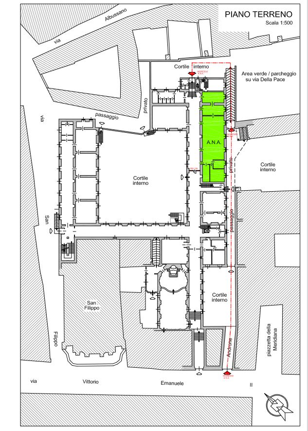 Rusco passa poi alla proposta. “Si propone di separare fisicamente la sede A.N.A. dal resto del complesso San Filippo. La realizzazione di un muro con caratteristiche REI 120 nel corridoio al piano terreno, a tutt’altezza, oltre la porta che consente l’accesso al cortile, separa la sede A.N.A. dal resto del complesso San Filippo, una compartimentazione a norma di VV.F. che stacca fisicamente lo spazio assegnato agli Alpini da ogni altra attività svolta al piano terreno. Il nuovo ingresso è previsto in via Vittorio Emanuele 65; percorrendo un passaggio privato ad uso pubblico si raggiunge il cortile in fondo, da cui si accede al cortile interno in cui è situato l’ingresso alternativo ai locali del piano terreno che ospitano la sede A.N.A. Un percorso agevole che non interferisce in alcun modo col resto del complesso San Filippo. Nella nuova muratura di separazione, realizzata nel corridoio, è inserita una porta con le stesse caratteristiche REI della muratura che la contiene; questo per consentire un comodo accesso agli impianti situati in questa porzione di edificio da parte della Civica Amministrazione e non compromettere la funzionalità del Complesso. Qualora l’Amministrazione ritenesse necessario mantenere l’accessibilità all’intero corridoio, utilizzando l’uscita su cortile, la nuova porta REI ne consentirebbe la fruizione totale degli spazi. Naturalmente l’accesso alla restante parte del corridoio al piano terreno è interdetta agli Alpini. La descrizione delle opere da eseguire e la quantificazione dei costi verrà indicata in seguito, ad accettazione della presente proposta. Certi che la soluzione proposta possa risolvere in forma temporanea e/o definitiva le incongruenze rilevate dalla Civica Amministrazione, per la presenza della nostra associazione all’interno del Complesso, in attesa di riscontro, porgiamo i più Cordiali Saluti.”