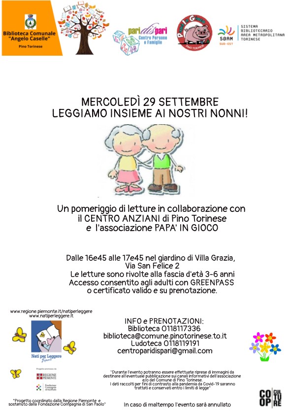 Pino Torinese. Mercoledì 29/9 lettura con i nonni alla Biblioteca Comunale.