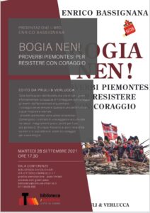 Nel pomeriggio del 28 settembre alle ore 17.30, nella Sala Conferenze della Biblioteca, il giornalista Enrico Bassignana presenterà il suo libro Bogia nen! Proverbi piemontesi per resistere con coraggio. E’ il secondo appuntamento di questi nuovi incontri con l’Autore.E’ gradita la prenotazione, essendo i posti limitati.Per l’accesso, è necessario il green pass.
