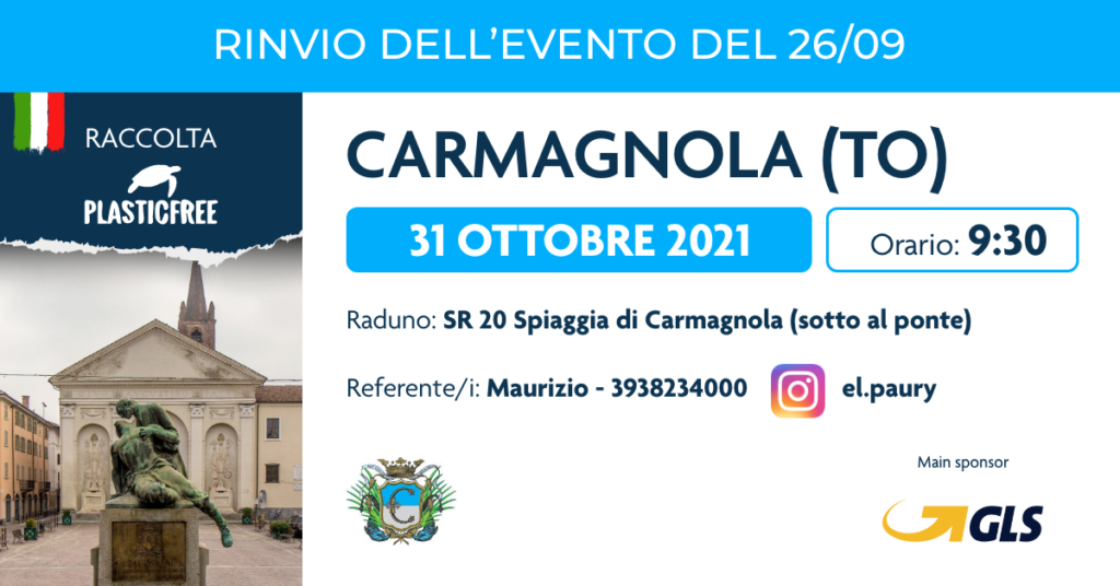 La raccolta Plasticfree nel comune di Carmagnola che non è stata possibile effettuare in data 26/09/21 causa maltempo è stata spostata in data 31/10/21 nel medesimo luogo ed orario. Le modalità di raccolta saranno le medesime e quindi si richiede sempre l’iscrizione tramite il link: