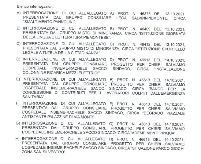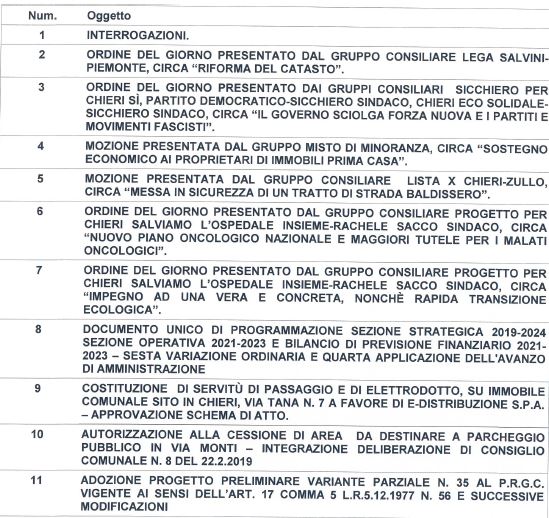 Il consiglio comunale di Chieri è convocato in seduta pubblica, alle 19,45 di giovedì 21 e venerdì 22 ottobre, presso la Biblioteca Civica Francone – Sala Studio Roccati. Qui di seguito l’ordine del giorno.