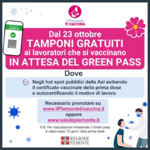 Dal momento che per disposizione ministeriale il Green pass è valido solo dopo 15 giorni dalla prima dose di vaccino, la Regione Piemonte ha deciso di mettere a disposizione, a partire da domani, sabato 23 ottobre, il tampone gratuito per tutti i lavoratori che dopo aver ricevuto la prima dose sono in attesa della validazione del Green pass. Per accedere agli hotspot pubblici è necessario prenotare il tampone attraverso il portale www.ilPiemontetivaccina.it o su www.salutepiemonte.it: inserendo i dati di codice fiscale e tessera sanitaria sarà possibile scegliere hotspot del proprio territorio di residenza, ma anche data e ora dell’appuntamento in base alle disponibilità. Il cittadino dovrà poi portare con sé ed esibire presso l’hotspot il certificato vaccinale della prima dose già effettuata e l’autocertificazione della necessità di Green pass per lavoro. “Abbiamo scelto questa procedura – sottolinea il presidente della Regione Alberto Cirio – per agevolare i cittadini nell’organizzazione della propria giornata. Sarà così possibile evitare che si formino code e ottimizzare al massimo i tempi di attesa per il tampone. In Piemonte ci sono ancora più di 280 mila persone in età lavorativa non vaccinate e ci auguriamo che questo possa essere un incentivo in più per scegliere il vaccino che è lo strumento più forte che abbiamo per mettere in sicurezza la nostra vita e il nostro lavoro. Un grazie particolare va alle nostre Aziende sanitarie che ancora una volta si sono strutturate in pochissimo tempo per offrire questo servizio in più”.