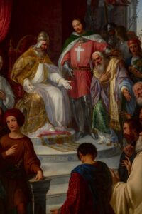 Il “Grande Assente” ritorna ai Musei Reali. Dopo diversi mesi di attente indagini diagnostiche e scrupoloso restauro, da lunedì 18 ottobre il dipinto Amedeo VI presenta a Urbano V il patriarca di Costantinopoli, dedicato al celebre Conte Verde, è finalmente stato ricollocato al suo posto d’onore nella Galleria della Sindone. Nell’autunno 2020 l’importante tela, realizzata nel 1849 dal pittore livornese Tommaso Gazzarrini su commissione di Re Carlo Alberto e gravemente danneggiata nel 1997 durante l’incendio della Cappella della Sindone, è stata protagonista di una raccolta fondi digitale, nata dal desiderio di restituire al pubblico del museo e alla cittadinanza il grande quadro in deposito da molti anni. La campagna intitolata “Il Grande Assente”, promossa dal Rotary Club Torino Palazzo Reale e da un team di giovani partecipanti del corso di alta formazione Talenti per il Fundraising della Fondazione CRT con la supervisione dei Musei Reali, ha coinvolto 372 donatori, con il contributo dei quali è stato portato a termine l’impegnativo lavoro di recupero del dipinto. Già a novembre, nell’arco di due settimane dal lancio della raccolta fondi, il primo traguardo di 3.000 euro era stato raggiunto, grazie al sostegno di tanti donatori, e subito alzato; ad ogni nuovo obiettivo raggiunto, il successivo si alzava, fino al superamento di quello finale da 15.000 euro. Un successo reso possibile anche grazie al supporto di alcuni major donors, tra i quali Borsa Italiana (espressione del mondo dell’alta imprenditoria), l’associazione Amici della Galleria Sabauda, Giubileo (ideale rappresentante delle attività del territorio), il Rotary Club Torino Castello (prestigioso testimone del mondo dei Club Service) e i privati cittadini Anna e Sergio Chiarloni.