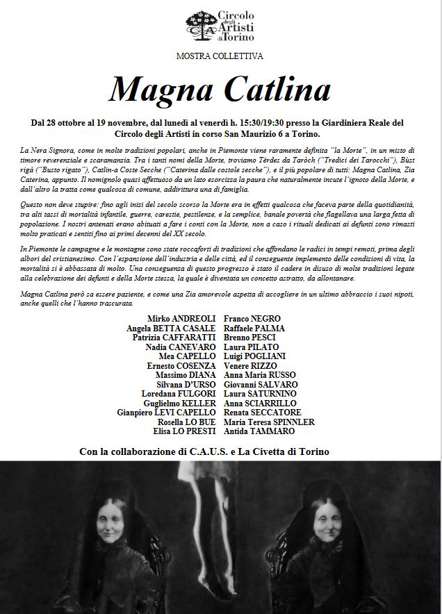 Inaugurazione della mostra Magna Catlina, che si terrà giovedì 28 ottobre alle 18:00 al Circolo degli Artisti, con le opere di 26 artisti che si sono confrontati su di una tematica che da anni viene affrontata in questo periodo dai Soci del Circolo. Questa tradizione avviata già nel 2015 con il CAUS, Centro Arti Umoristiche e Satiriche, da un’idea di Raffaele Palma, portando gli Artisti a dipingere, secondo una tematica sempre diversa presso lo statuario del Cimitero Monumentale di Torino si era interrotta con l’esposizione del 2019 dedicata al Dia de los Muertos messicano e alla sua figura più rappresentativa, inaugurata dal neo Ambasciatore del Messico in Italia, Carlos Garcia de Alba Zepeda. Quest’anno la tematica sarà tutta piemontese, La Nera Signora, come in molte tradizioni popolari, anche in Piemonte viene raramente definita “la Morte”, in un misto di timore reverenziale e scaramanzia. Tra i tanti nomi della Morte, troviamo Tërdes da Taròch (“Tredici dei Tarocchi”), Bùst rigà (“Busto rigato”), Catlin-a Coste Secche (“Caterina dalle costole secche”), e il più popolare di tutti: Magna Catlina, Zia Caterina, appunto. Il nomignolo quasi affettuoso da un lato esorcizza la paura che naturalmente incute l’ignoto della Morte, e dall’altro la tratta come qualcosa (qualcuno) di comune, addirittura una di famiglia.