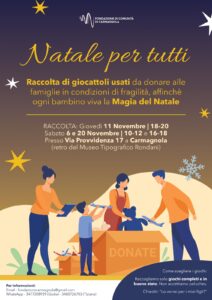 La Fondazione di Comunità di Carmagnola propone “Natale per tutti”, una raccolta di giocattoli usati da donare alle famiglie meno fortunate della comunità. Il progetto che prenderà il via il 6 Novembre, con la prima raccolta di giocattoli, vede coinvolte le Caritas cittadine nella ridistribuzione alle famiglie bisognose. “La Fondazione crede che il benessere creato da una comunità sensibile ai temi dell’inclusione e della donazione, non esclusivamente economica, sia inestimabile. Per questo abbiamo proposto Natale per Tutti che, grazie all’aiuto dei carmagnolesi, renderà felici tanti bambini e permetterà alle famiglie in condizioni di fragilità di trascorrere un Natale più sereno, con la consapevolezza di essere parte di una comunità attenta e coesa. Inoltre con questa iniziativa vogliamo promuove anche il riuso e il riciclo di beni e dei materiali, in un’ottica di sostenibilità. Ringrazio tutti coloro che ci hanno aiutato e che ci aiuteranno in questo progetto.” Queste le parole di Carlo Boasso, Presidente della Fondazione di Comunità di Carmagnola.